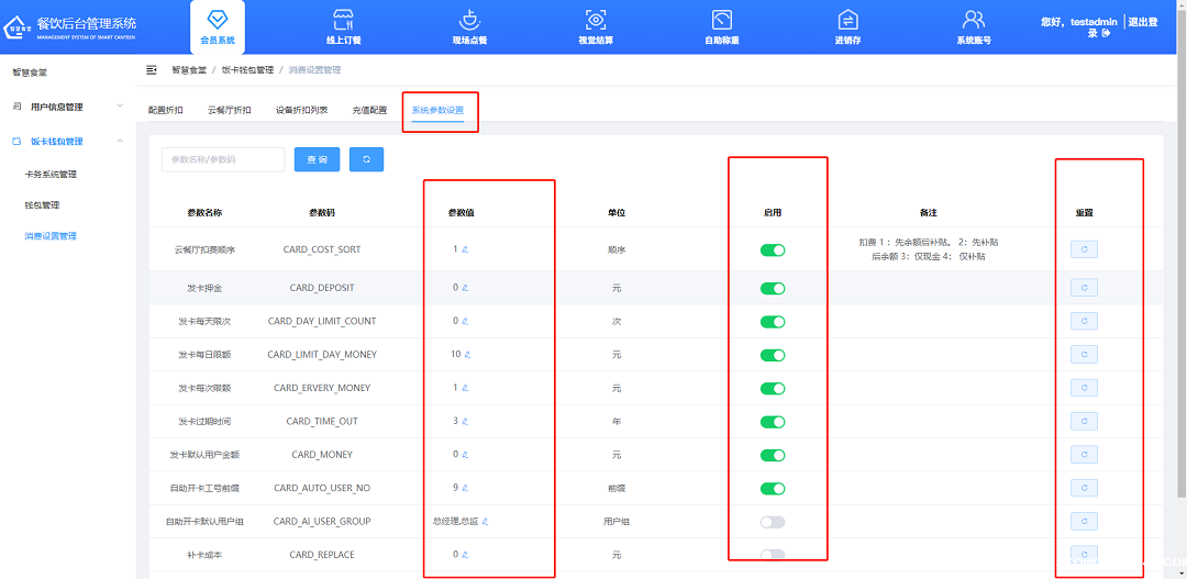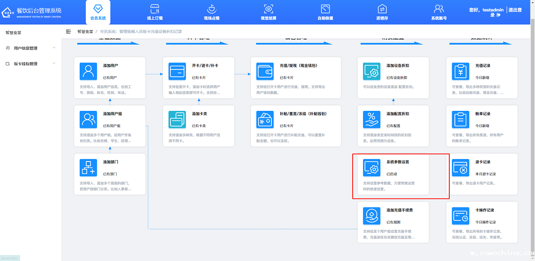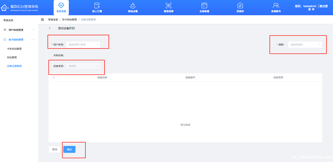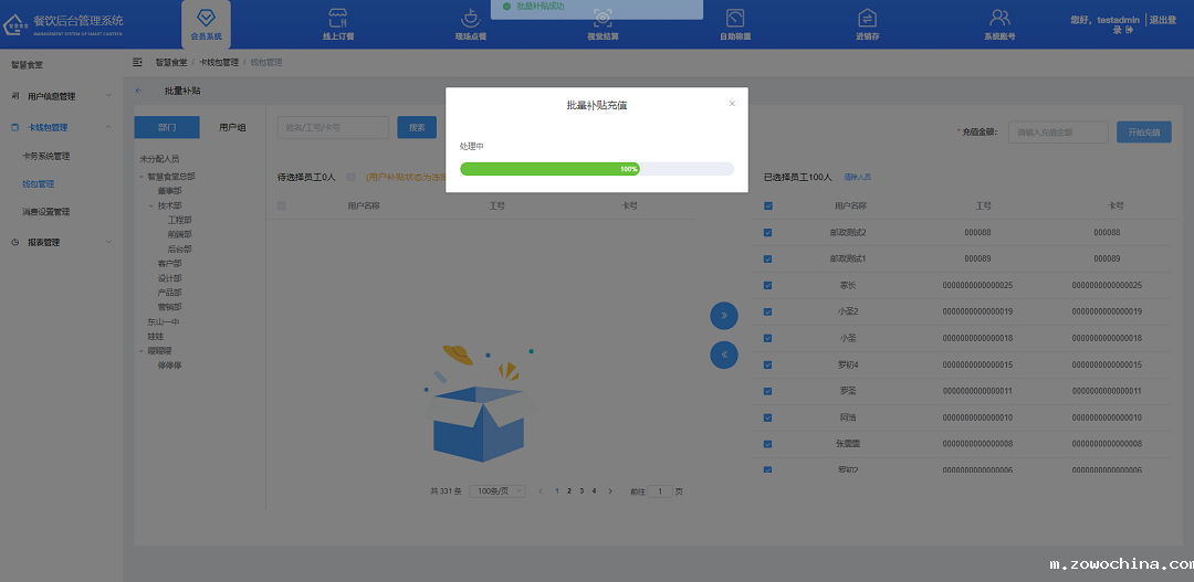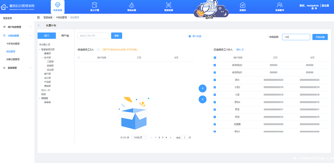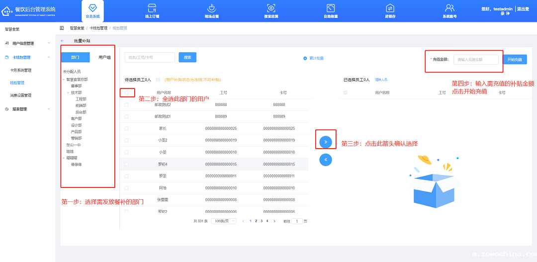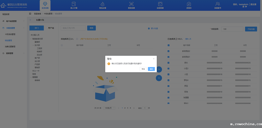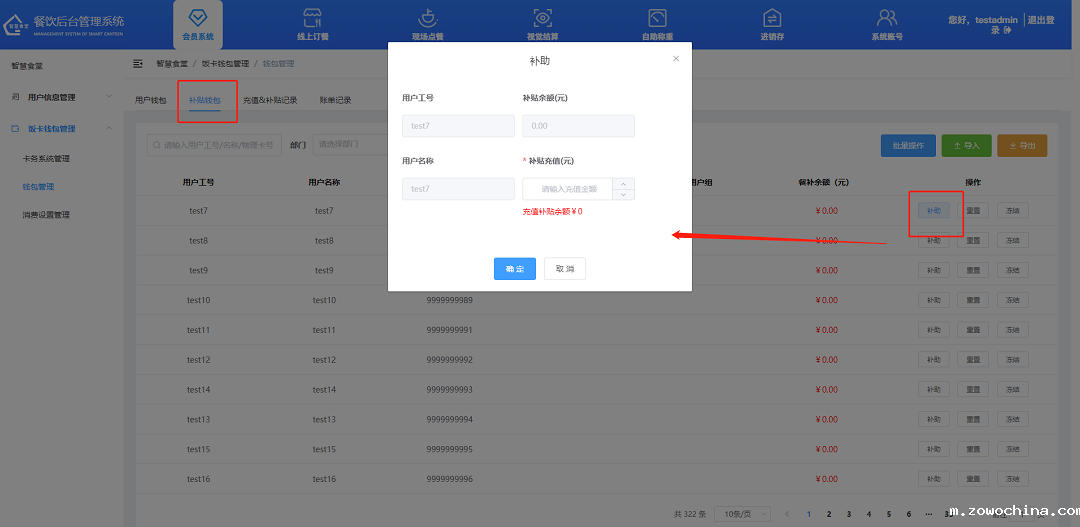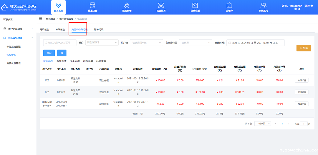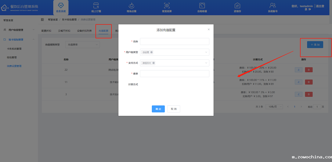 ①饭卡充值,点击“充值”按钮对用户进行充值,填写需充值的数额,选择支付方式,点击“确定”按钮,完成充值;