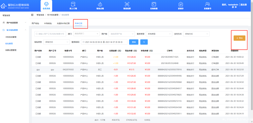 ①账单记录,可输入用户工号、名称、卡号,筛选支付账单类型查询消费记录。