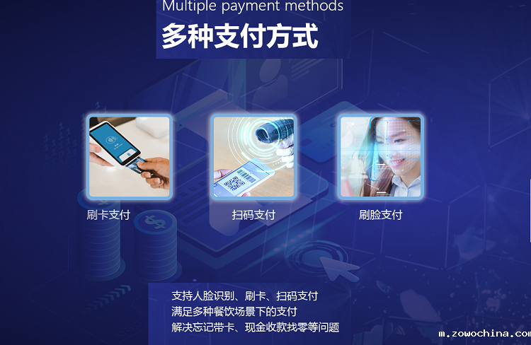 戈子科技智慧食堂可对接食堂一卡通系统,实现刷卡支付;为满足现代人消费习惯,戈子科技智慧食堂可使用微信、支付宝等扫码支付;戈子科技智慧食堂同时拥有先进的金融级AI人脸识别技术,员工在后台录入自己的人脸信息后即可使用人脸识别支付,人脸识别支付人均用时低于0.3秒,体现该技术的超高速识别。多种方式聚合支付的方式大幅度降低了就餐高峰期时的排队等待压力,总体提升企业食堂运营效率,提高员工就餐的便利性。