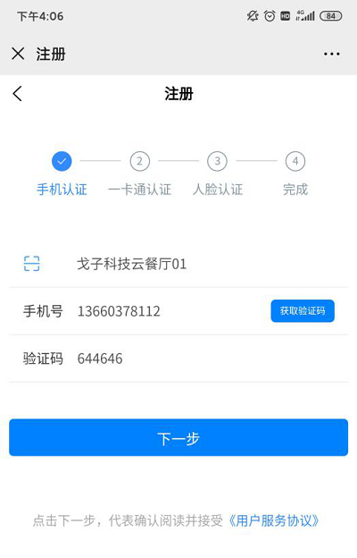 Ps:点击“跳过”按钮可以直接进入系统页面,但无法进行订餐支付。跳过后可在“我的”页中“卡号绑定”进行再次绑定。