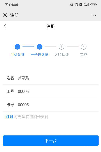 ①输入姓名、工号、卡号,点击“下一步按钮”,进入人脸绑定页面
