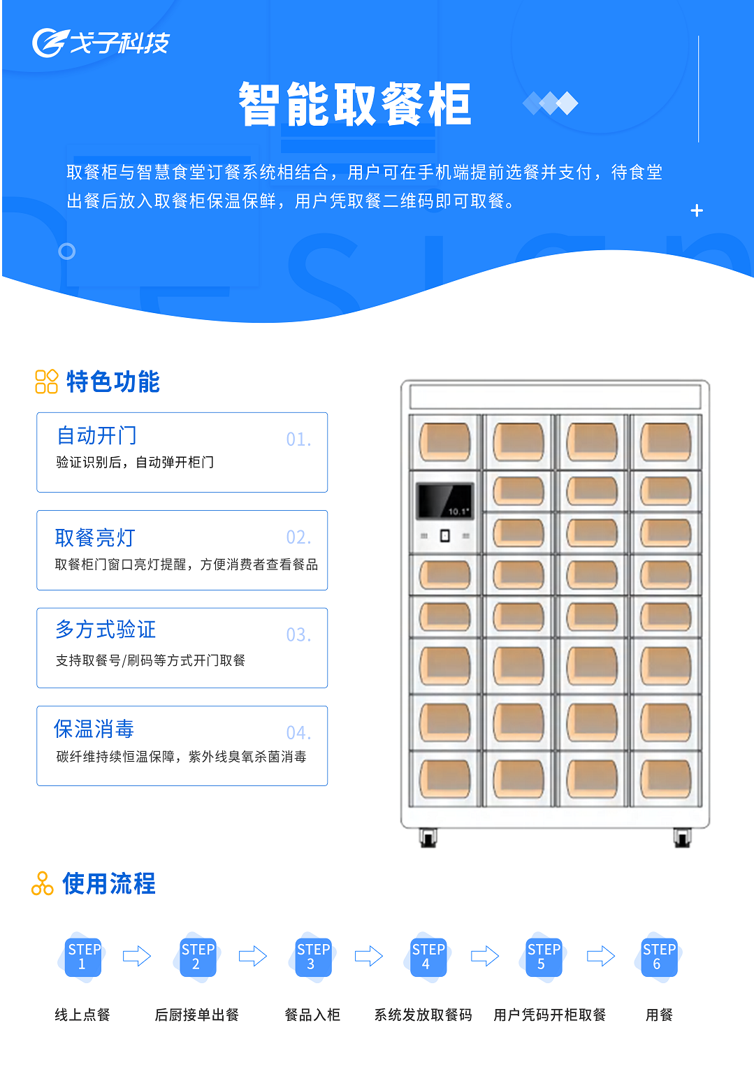 戈子科技智能取餐柜有保温、加热、制冷、消毒等多种功能,可以分散放置在食堂、员工办公区内,缓解员工排队拥挤,工作忙没有时间去食堂取餐问题。订餐人员根据收到的取餐二维码在餐柜扫码自提,简单方便,随时都可吃到的饭菜。