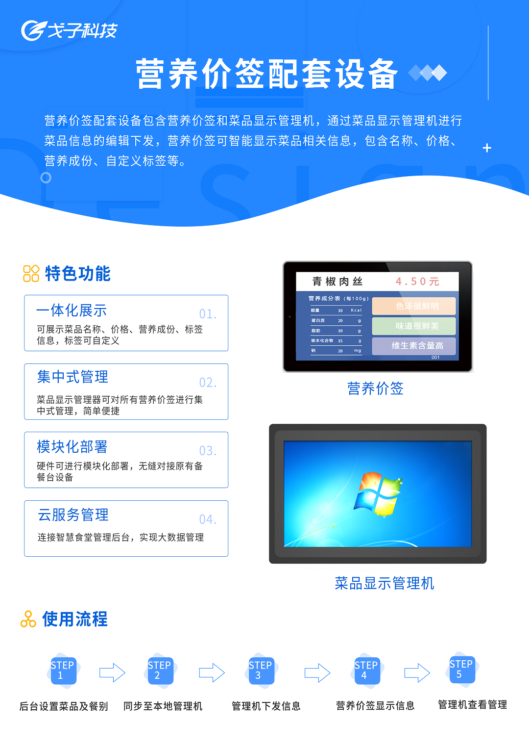 戈子科技的电子菜价标签主要是嵌入在智能备餐台内,将展现对应菜盆售卖菜品的品名、价格、营养标签和营养成分等情况。