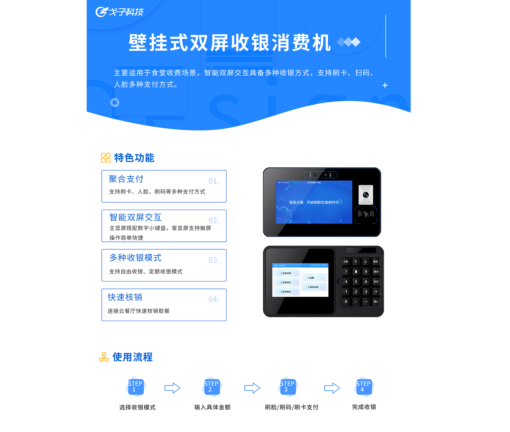 戈子科技壁挂式点餐机有效利用自助点餐系统搭合理搭配叫号取餐系统,人脸收银等设备硬件,无缝整合智慧餐厅的前端硬件和软件,后厨系统,实现对餐厅的集成化智能管理。在提高用户点餐订购效率和餐厅管理的同时提升顾客整体点餐体验与餐厅档次。