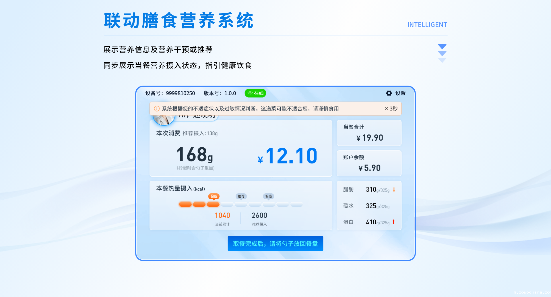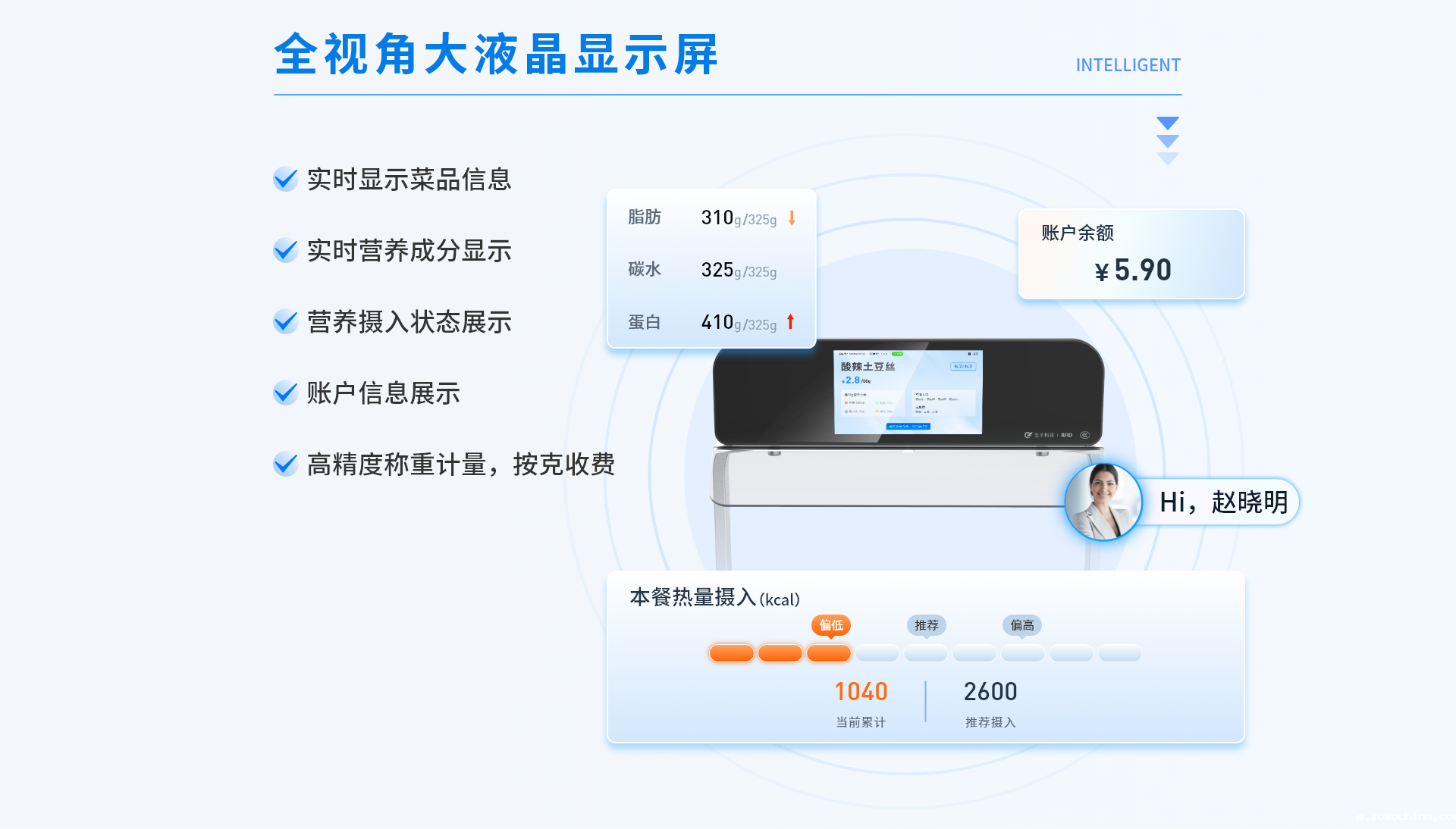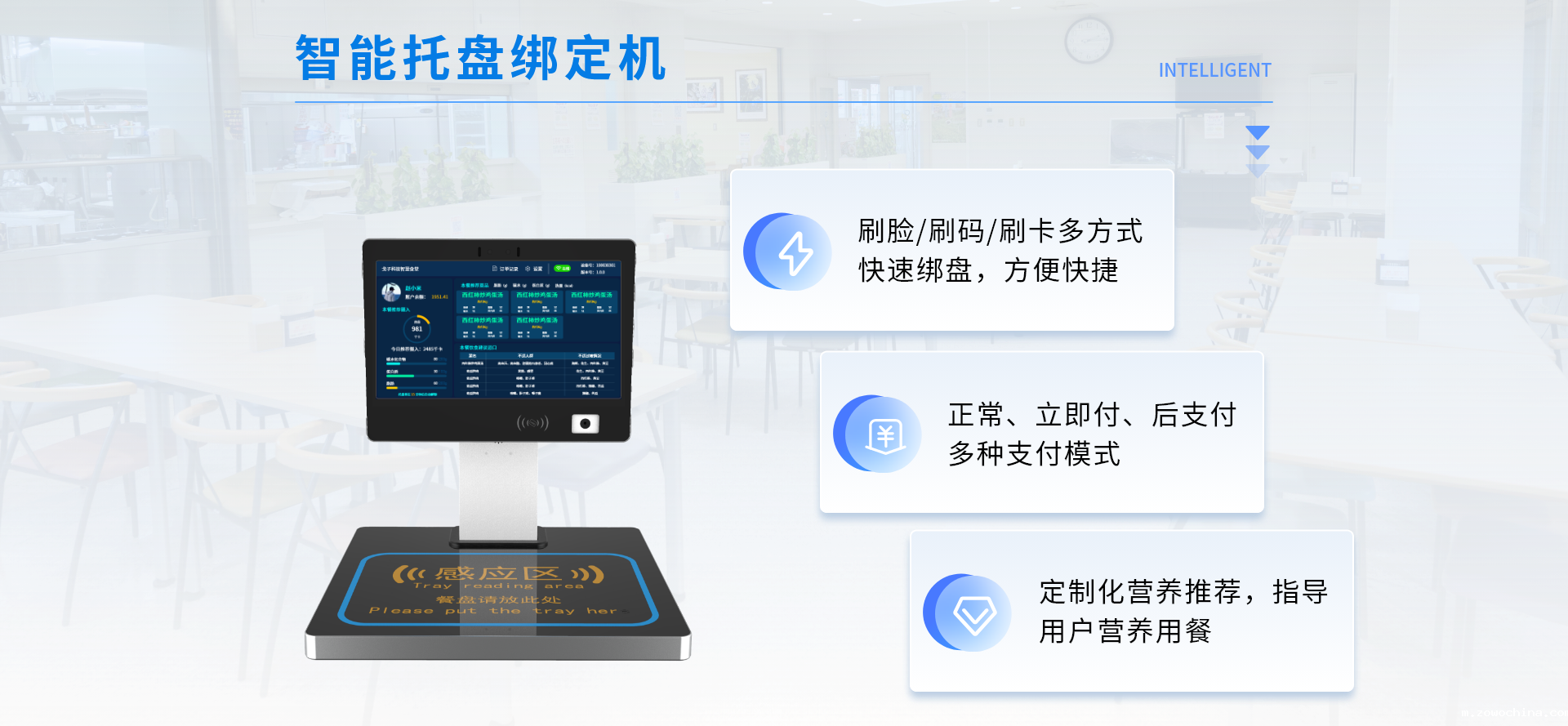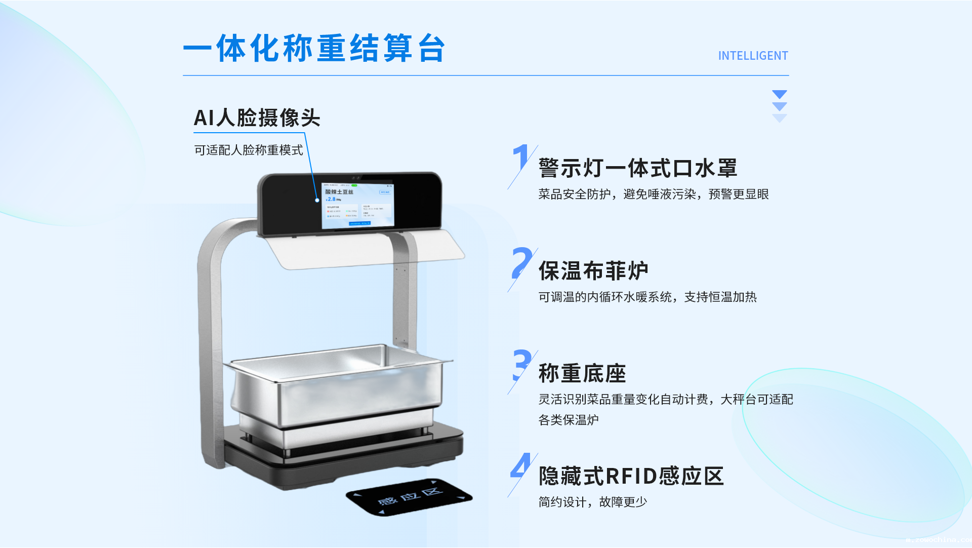 智能称重结算台一体化设计,基于餐饮云平台为就餐者提供的无感支付、自助餐饮的智能化集成式系统。用户绑定托盘后,通过托盘感应台读取托盘信息,即可在多个智能秤上自助称重取餐,取餐完成后通过空中支付进行就餐结算。